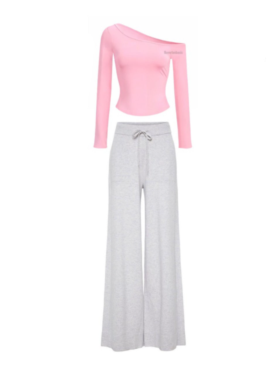 En el primer video la modelo usa el conjunto en el color Melange Gris y rosado