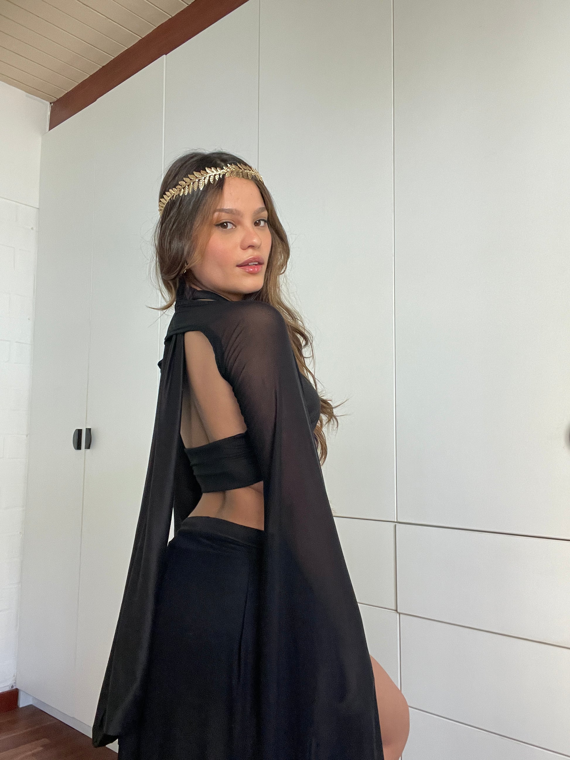 Disfraz incluye 4 piezas: top, mangas de tull transparentes, falda short con tull y Vincha dorada