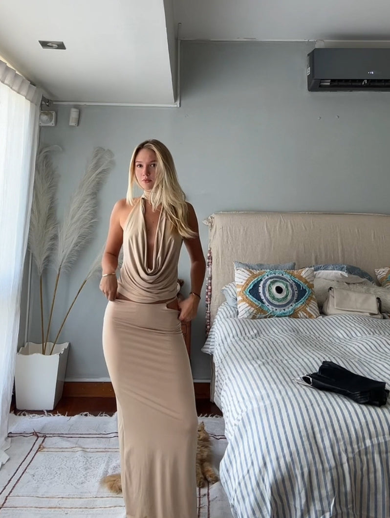 Elaborado en tela Venecia (lycra) modelo usa en color beige